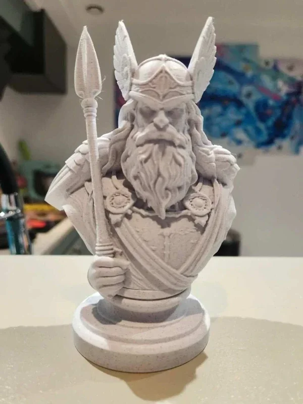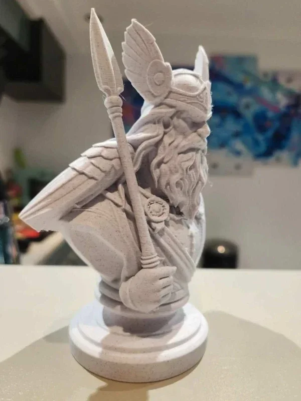 Buste représentant Odin, le Père de Tous dans la mythologie nordique. Symbole de sagesse, puissance et connaissance, Odin est ici sublimé par une finition marbre blanc élégante, rappelant les sculptures classiques. Cette pièce décorative forte attire immédiatement le regard et s’intègre parfaitement dans une décoration moderne, minimaliste ou mythologique. 📏 Caractéristiques Hauteur : 15 cm Largeur : env. 8–9 cm Matériau : impression 3D FDM Finition : marbre blanc (effet pierre sculptée)