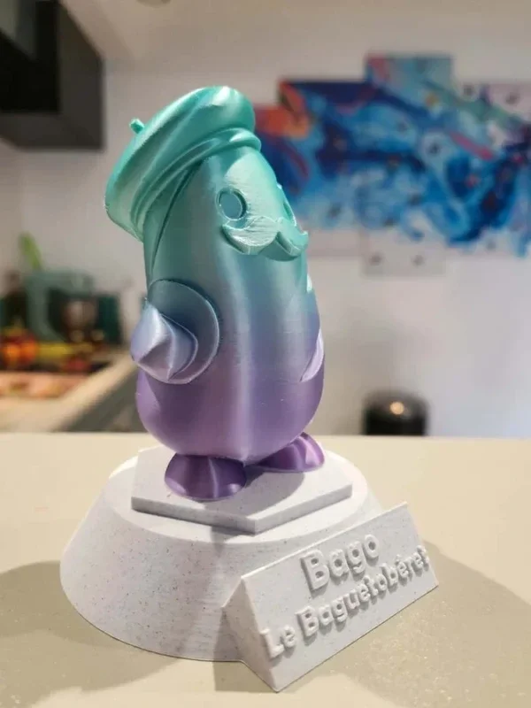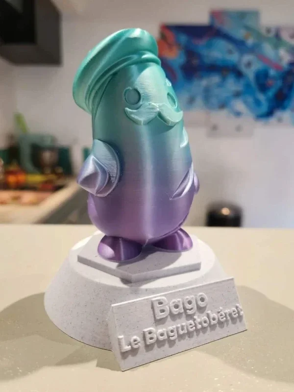 Je vous présente Bago le Baguetobéret la mascotte des Franzou's c'est une collection de petit personnage bien français Made in France By JustOnePrint d'autres personnages multicolore arrivent ! Il est équipé d'un QR code a scanner sous son socle pour vous ouvrir la playlist des Franzou's contenant quelques uns des plus grands succès musicaux français. Chaque pièce est unique car les couleurs varient selon les arrivages. Produit en impression 3D.