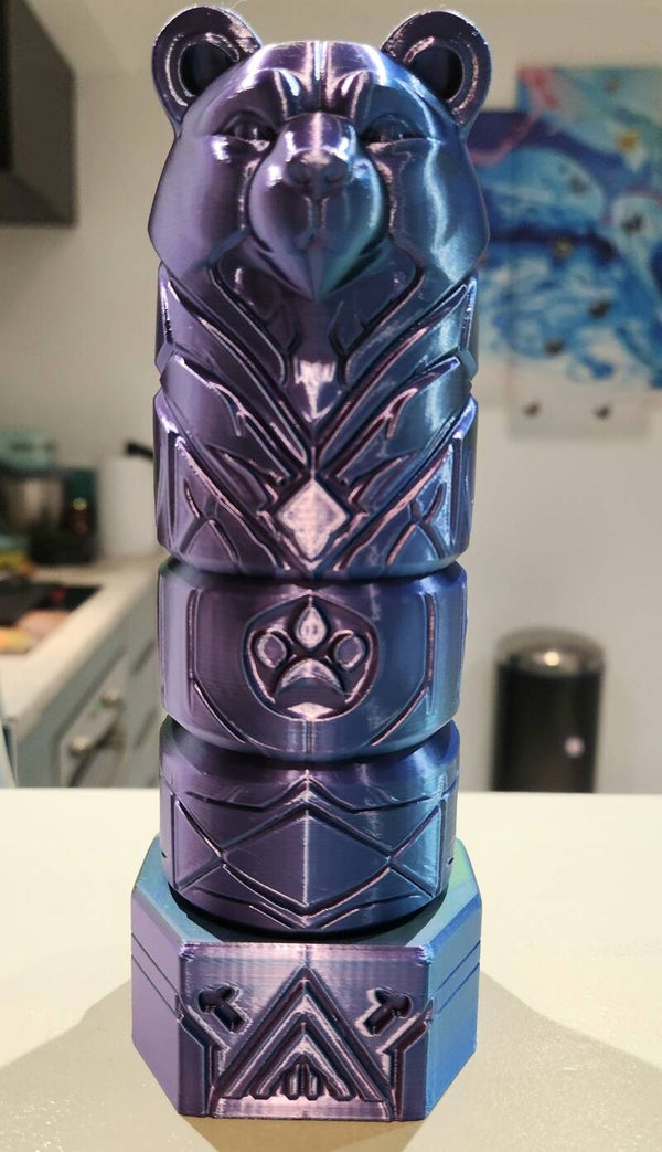 Le modèle présenté est imprimé en tricolore Bleu / Violet / Vert, ce qui met en valeur les volumes et les reliefs du totem.
